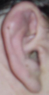 The ear continued to hurt and throb, and it was getting so swollen and deformed that the outer rim started to actually turn inside out a little bit. I haven't been to a doctor about anything in several years and generally go with the "ignore it and it'll go away eventually" theory of health care, so I continued to pretend that nothing was wrong for another week or so. Then one day last week I looked in the mirror and saw this beauty staring back at me: